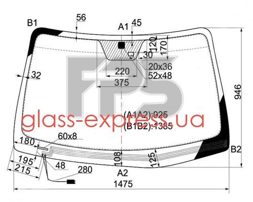 СКЛО ЛОБОВЕ, ЗЕЛЕНЕ, БЛАКИТНИЙ СВІТЛОФІЛЬТР, З ОБІГРІВОМ, З КРІПЛЕННЯМ ДАТЧИКА ВОЛОГОСТІ/СВІТЛА, З КРІПЛЕННЯМ ДЗЕРКАЛА, З VIN-ВІКНОМ, 1478*948